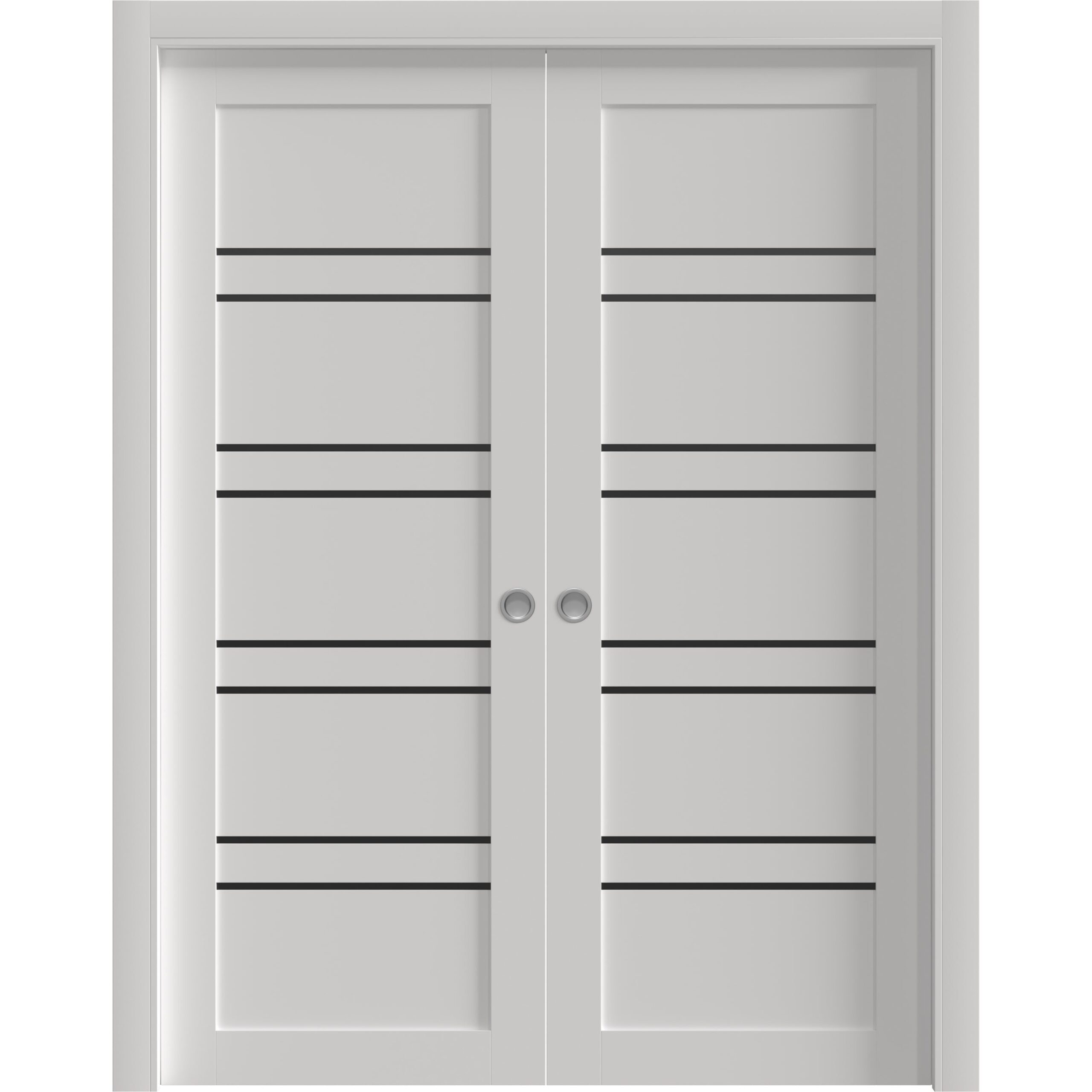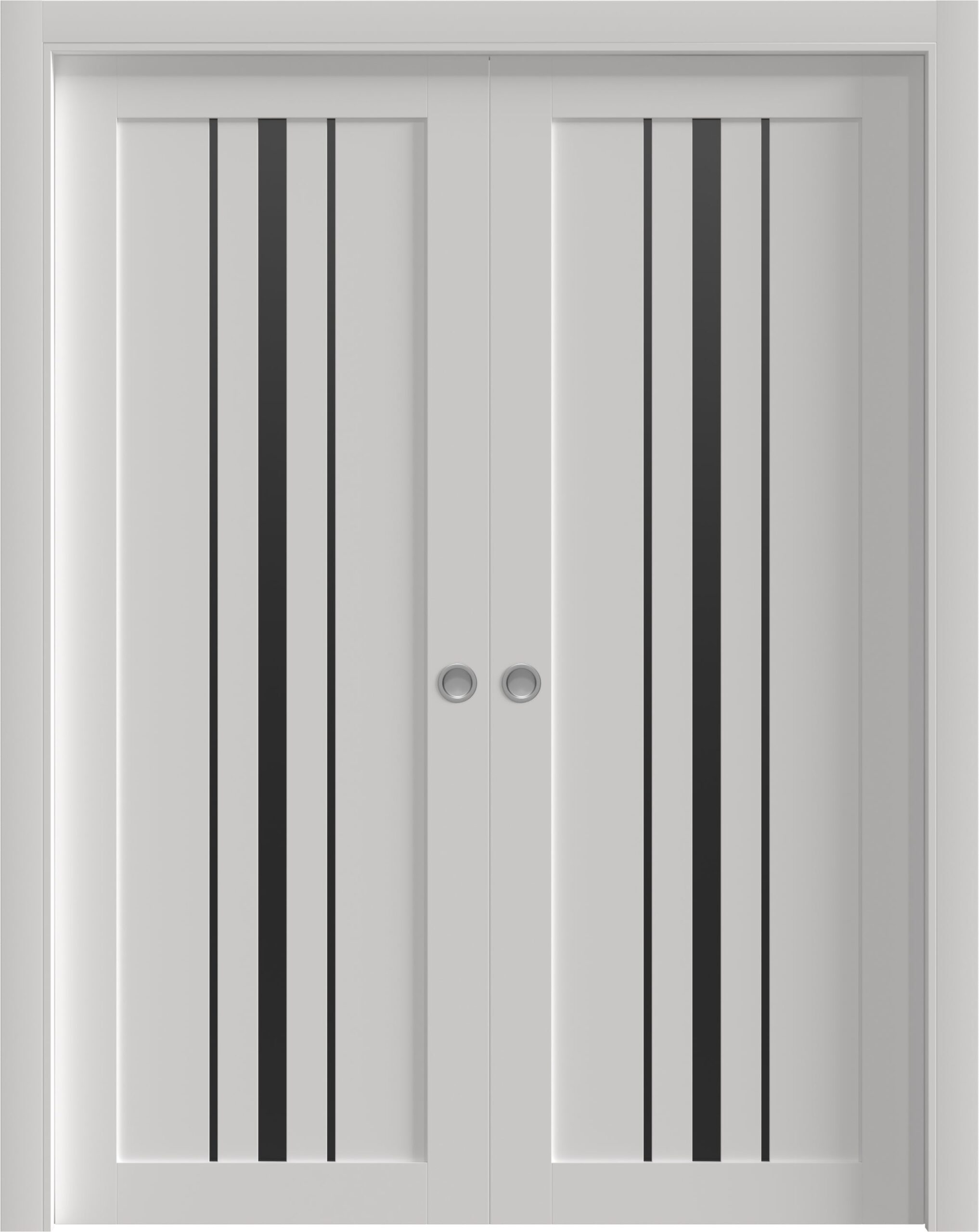 Sliding Double Pocket Doors | BASIC 4901 White with Black Glass | Kit Rail Hardware | Solid Wood Interior Bedroom Doors