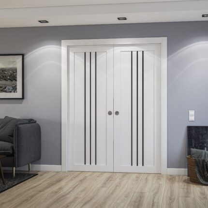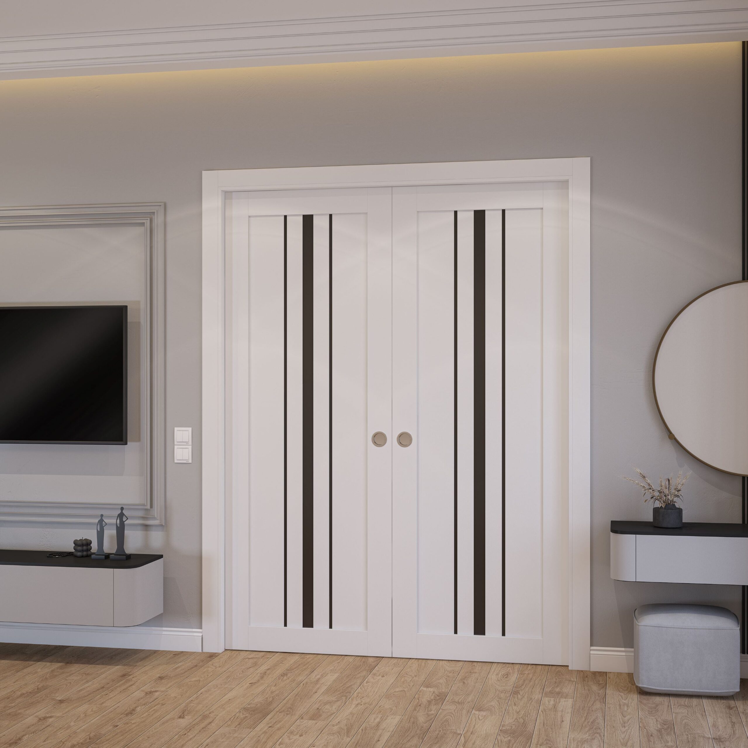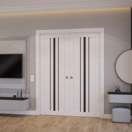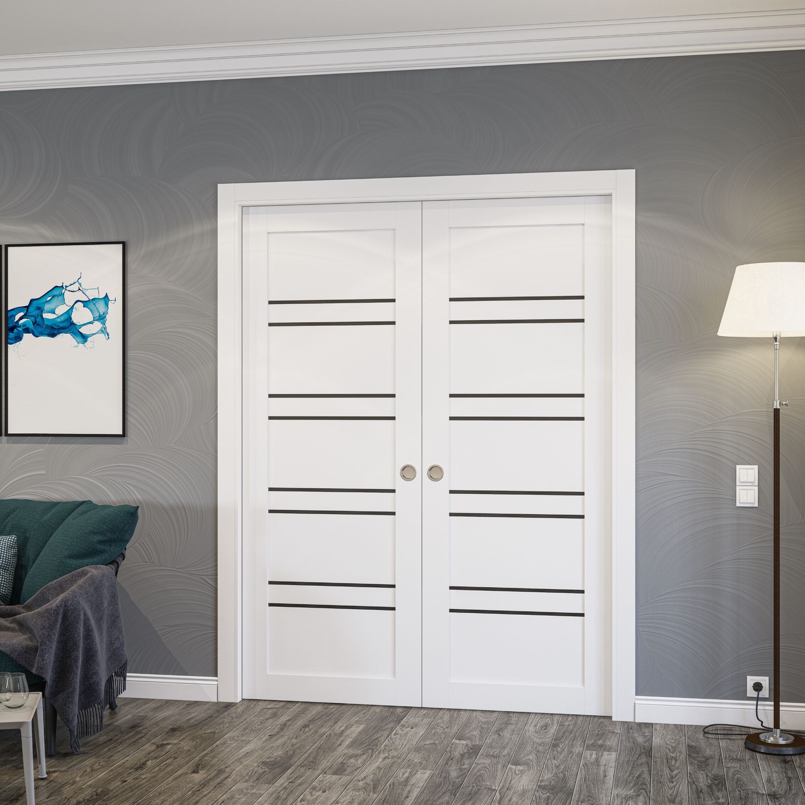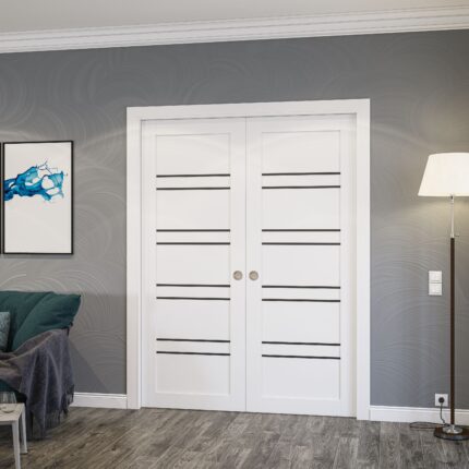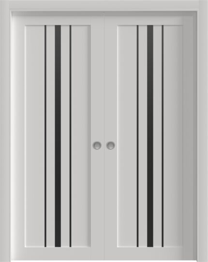 Sliding Double Pocket Doors | BASIC 4903 White with Black Glass | Kit Rail Hardware | Solid Wood Interior Bedroom Doors