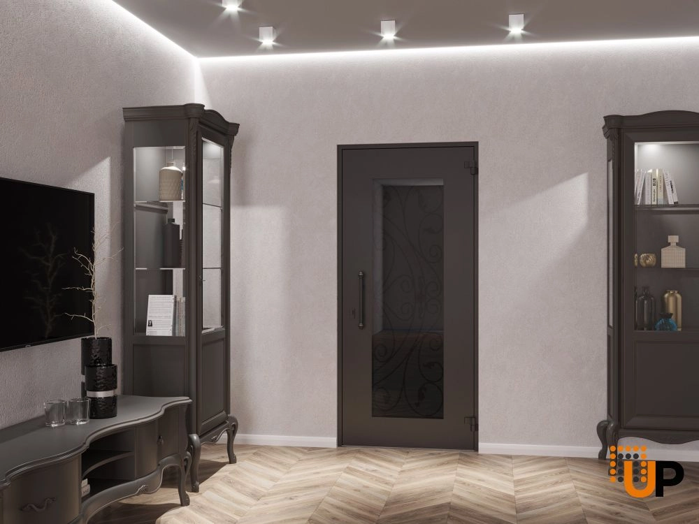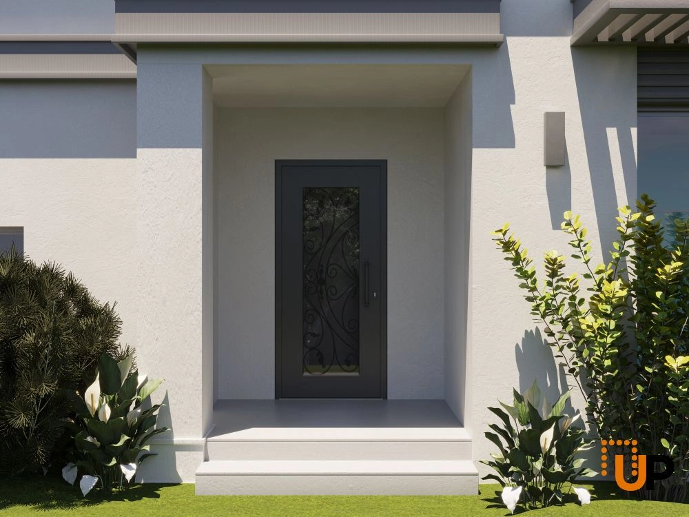 Single swing wrought iron modern exterior door with triplex glass.