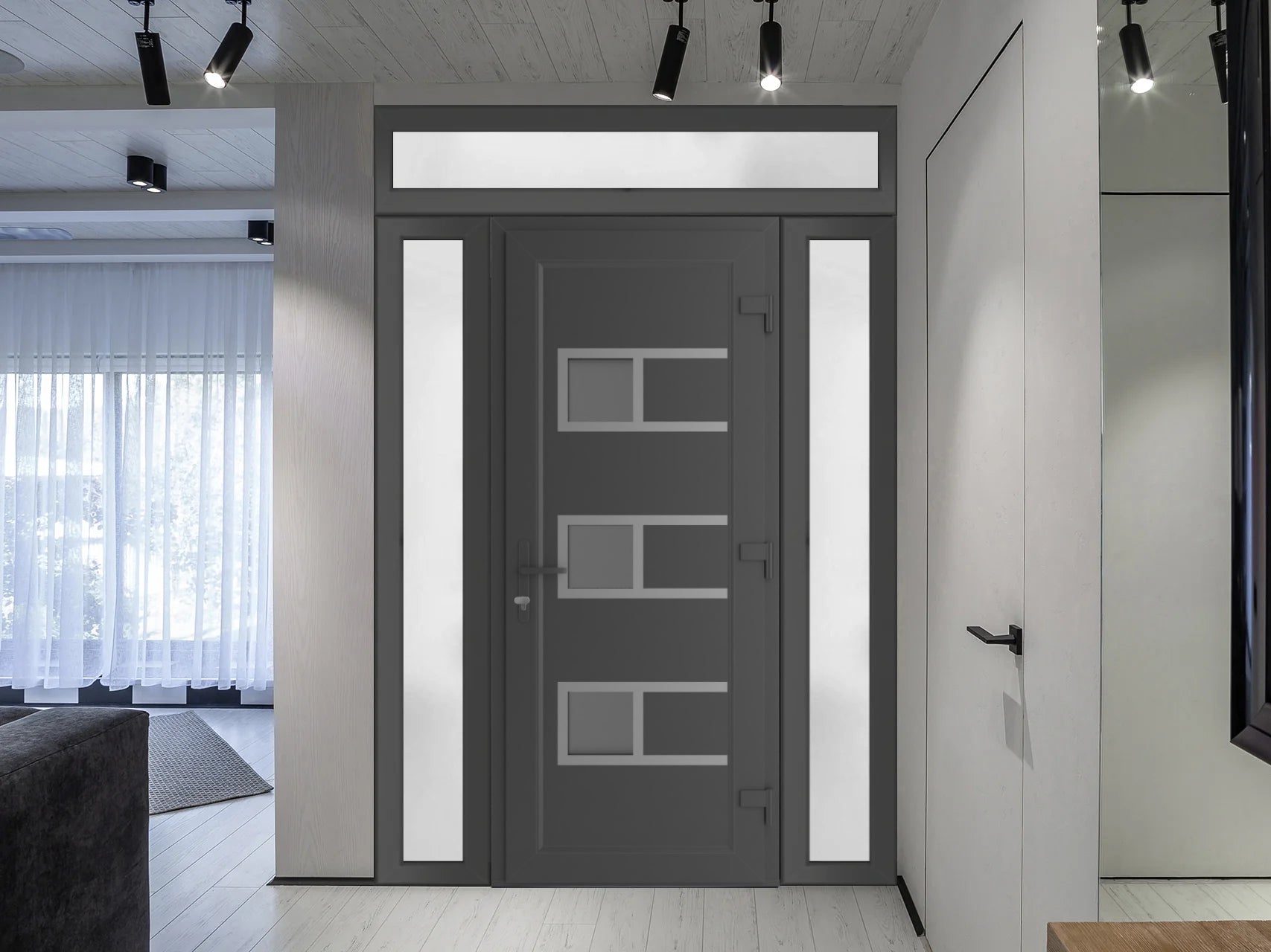 Front Exterior Prehung Metal – PlasticDoor | Manux 8933 Antracite Grey | 2 Side and Top Sidelite Transom | Office Commercial and Residential Doors Entrance Patio Garage