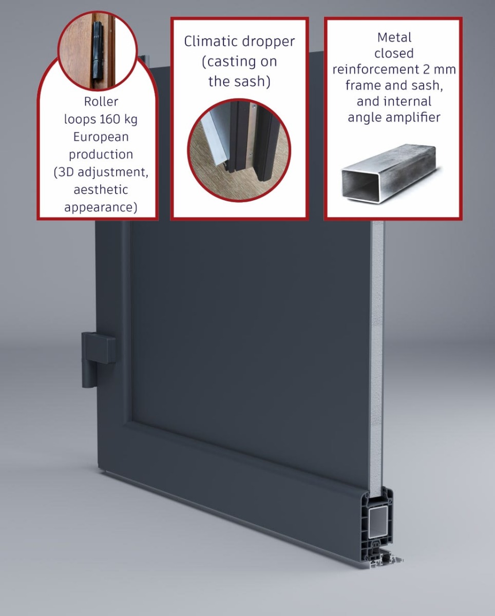 – We use an aluminum threshold with a special thermal insert that cuts off the cold from the room. We also complete with an amplifier to securely fix the bottom of the door and cut off the cold.