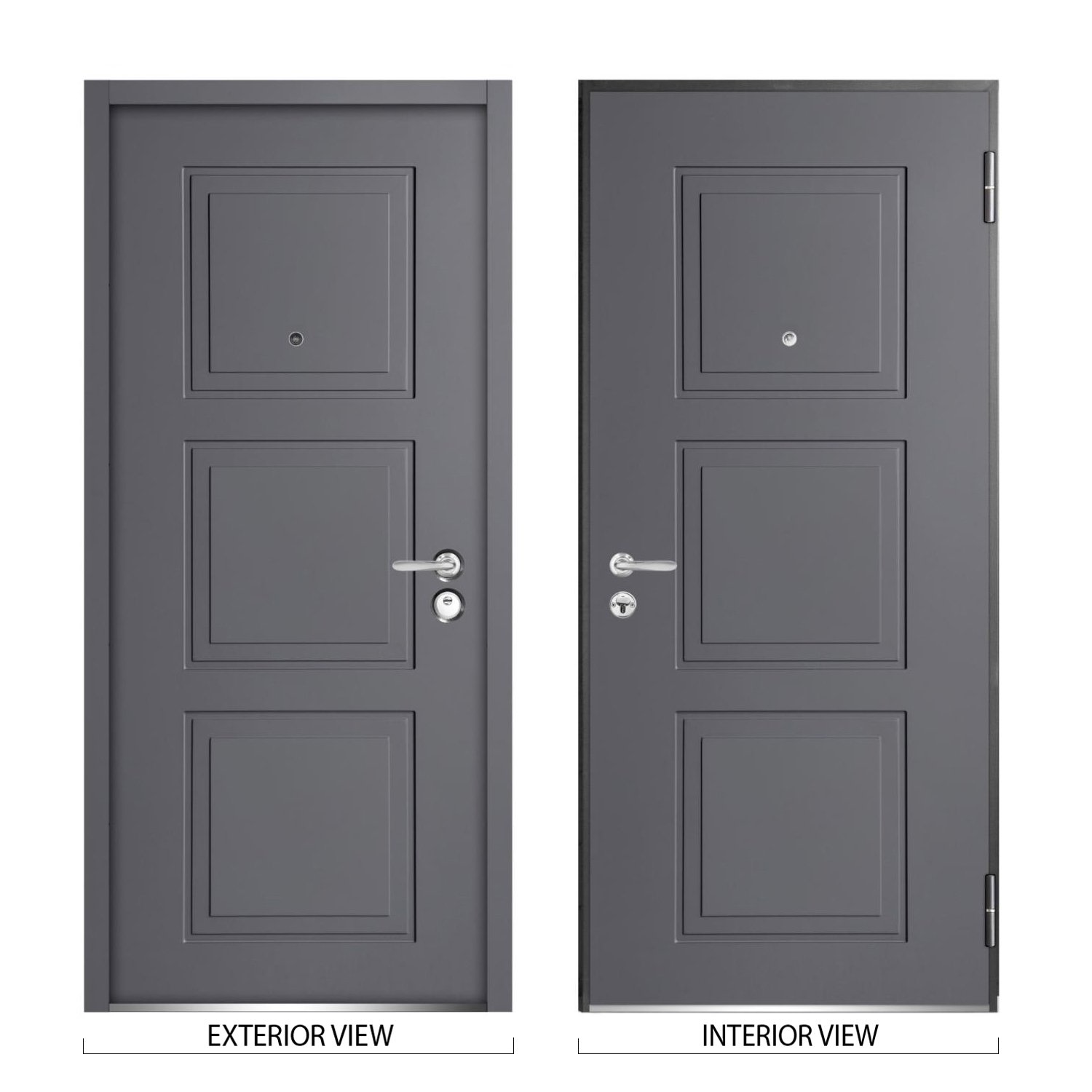 Exterior design – 3 panels. Coating of the door – Moisture resistant MDF layer 2/3″, gray enamel.