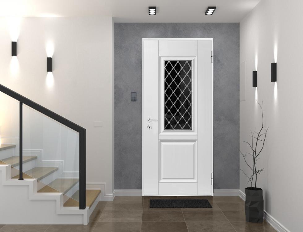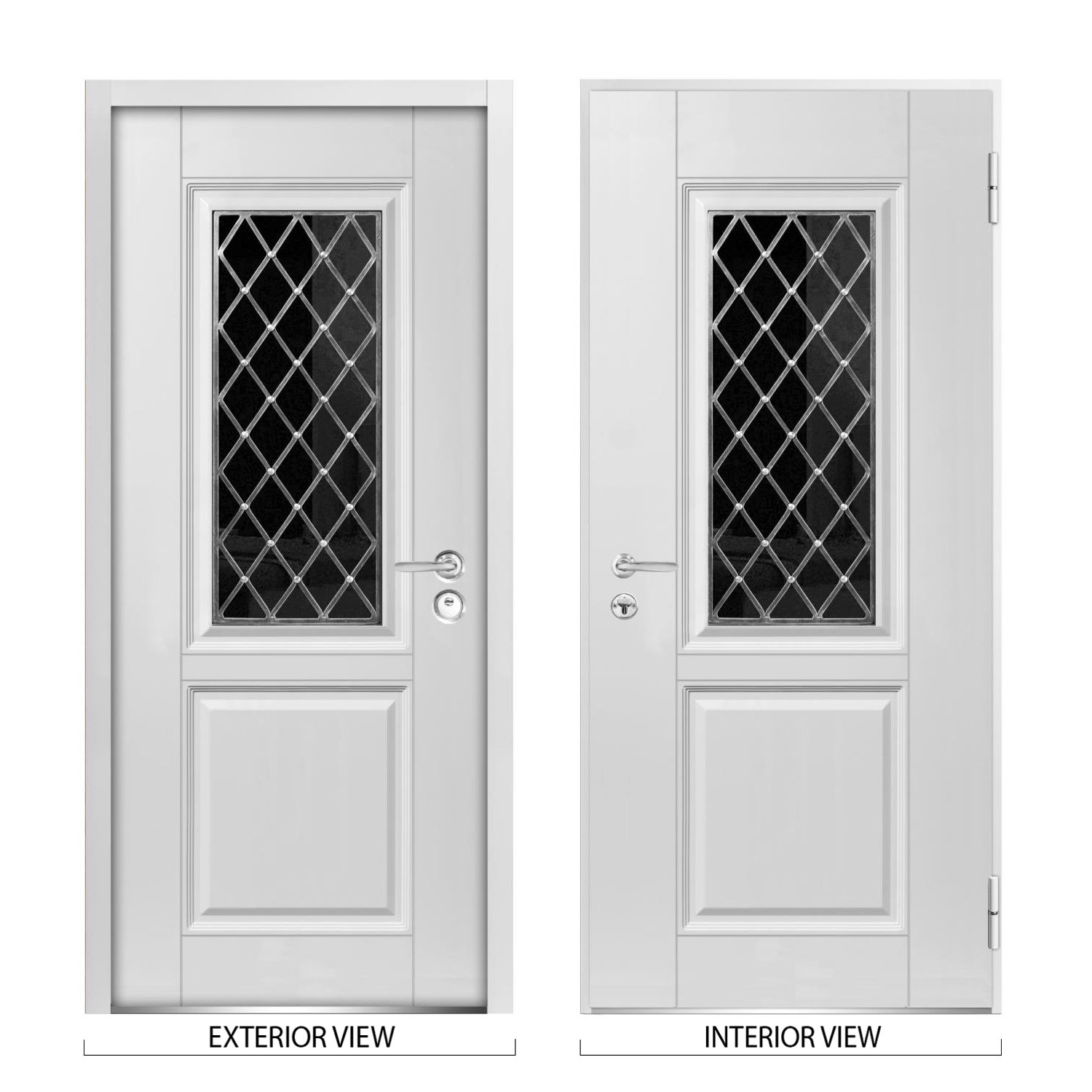 Exterior design – 1 panel, tinted glass with diamond-shaped grid. Coating of the door – Moisture resistant MDF layer 2/3″, white enamel.