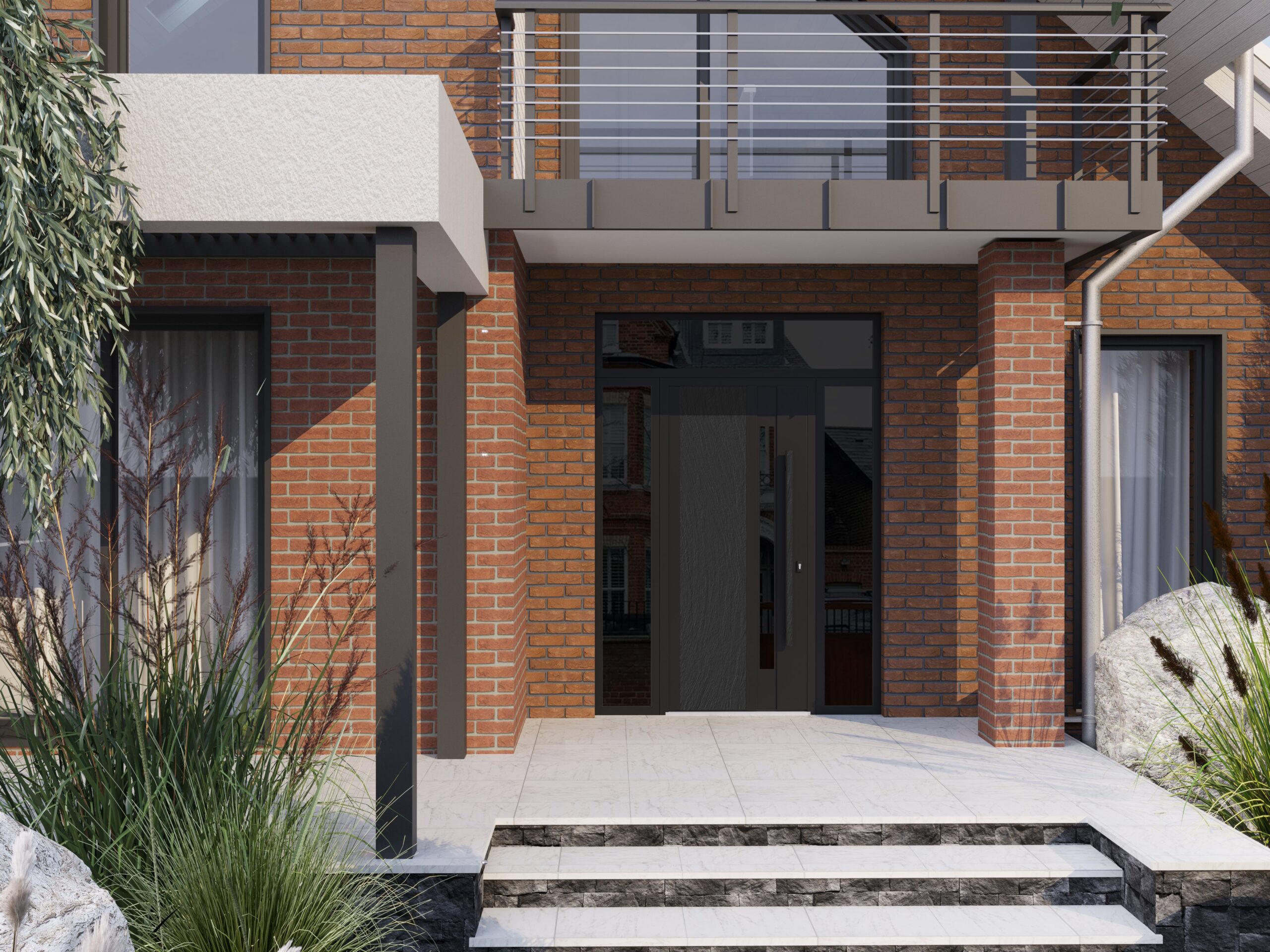Front Exterior Prehung Steel Door / Dekton 0163 Ardesia Nero / 2 Side and Top Exterior Window Sidelite / Entry Metal Modern Painted