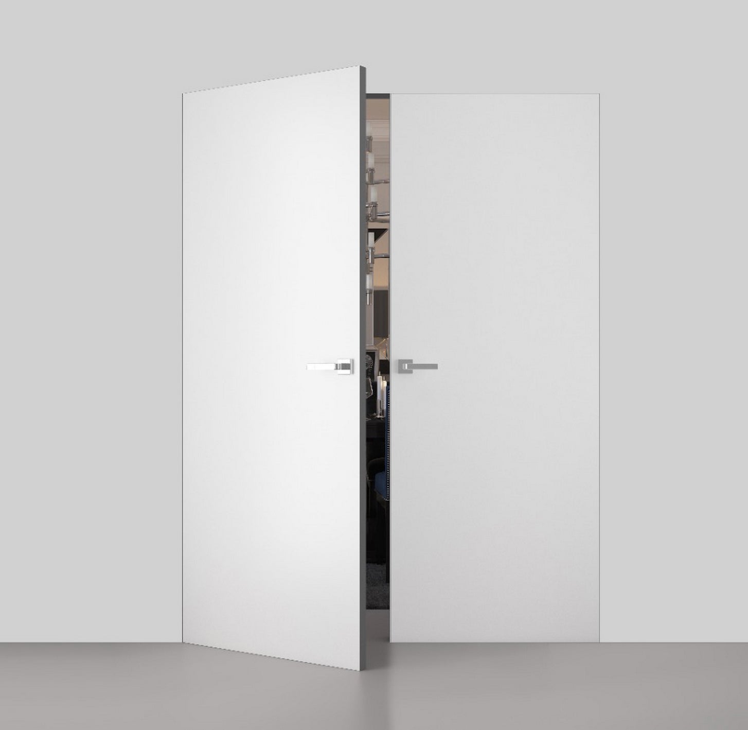 Modern Solid Double Hidden Door with Handle | Planum 0010 Primed with Silver Hidden Frame Left-hand Outswing Silver Frame | Hinges Lock Handle | Modern Wardrobe Wood Solid Doors