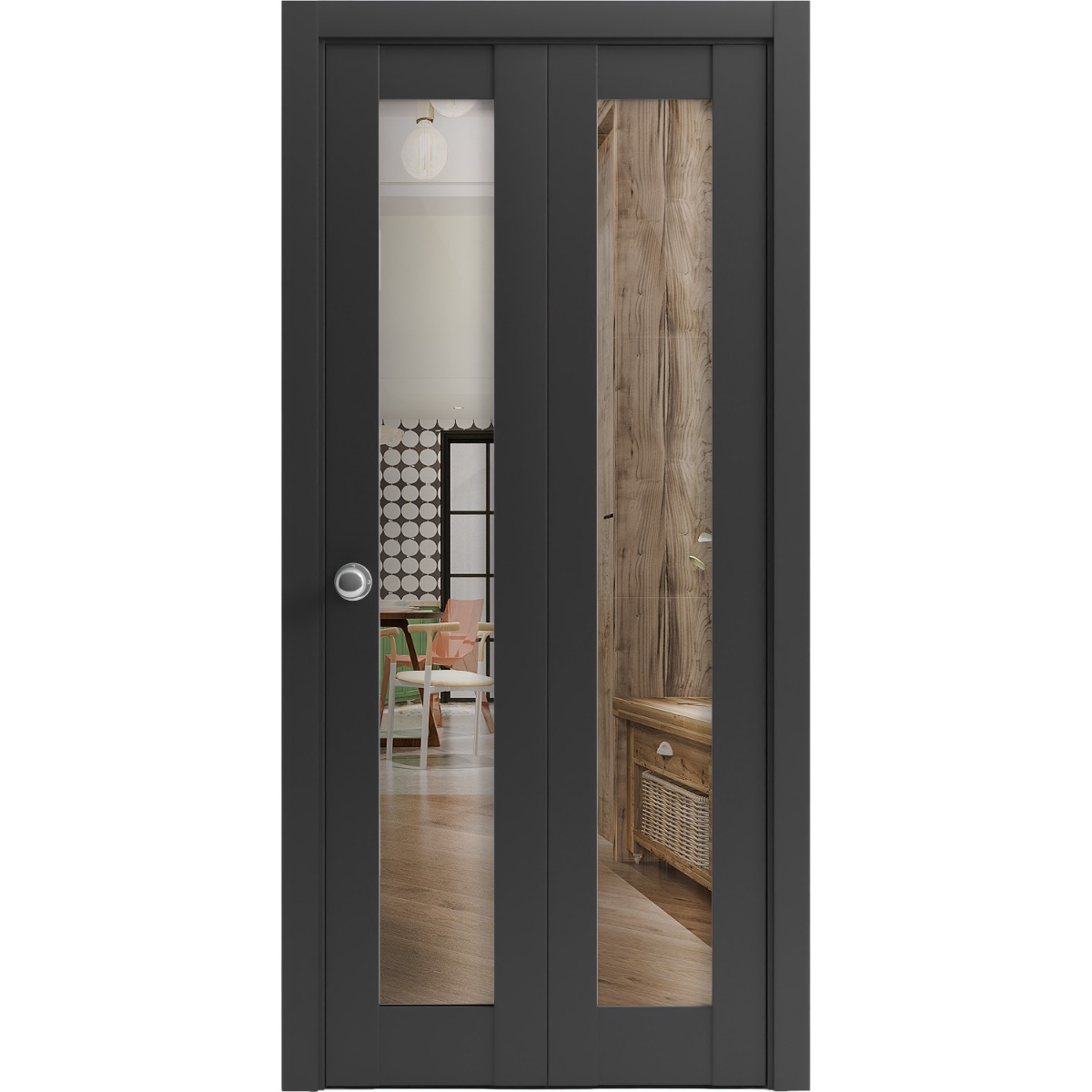 Sliding Closet Bi-fold Doors | Lucia 2166 Matte Black with Clear Glass | Sturdy Tracks Moldings Trims Hardware Set | Wood Solid Bedroom Wardrobe Doors