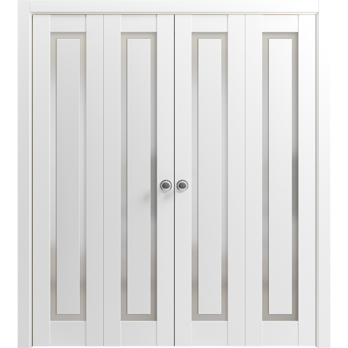 Sliding Closet Double Bi-fold Doors | Planum 0888 Painted White with Frosted Glass | Sturdy Tracks Moldings Trims Hardware Set | Wood Solid Bedroom Wardrobe Doors