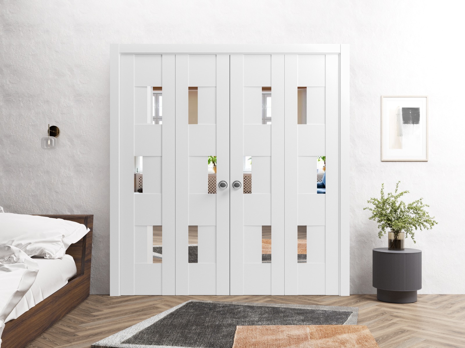 Sliding Closet Double Bi-fold Doors | Sete 6999 White Silk with Mirror | Sturdy Tracks Moldings Trims Hardware Set | Wood Solid Bedroom Wardrobe Doors