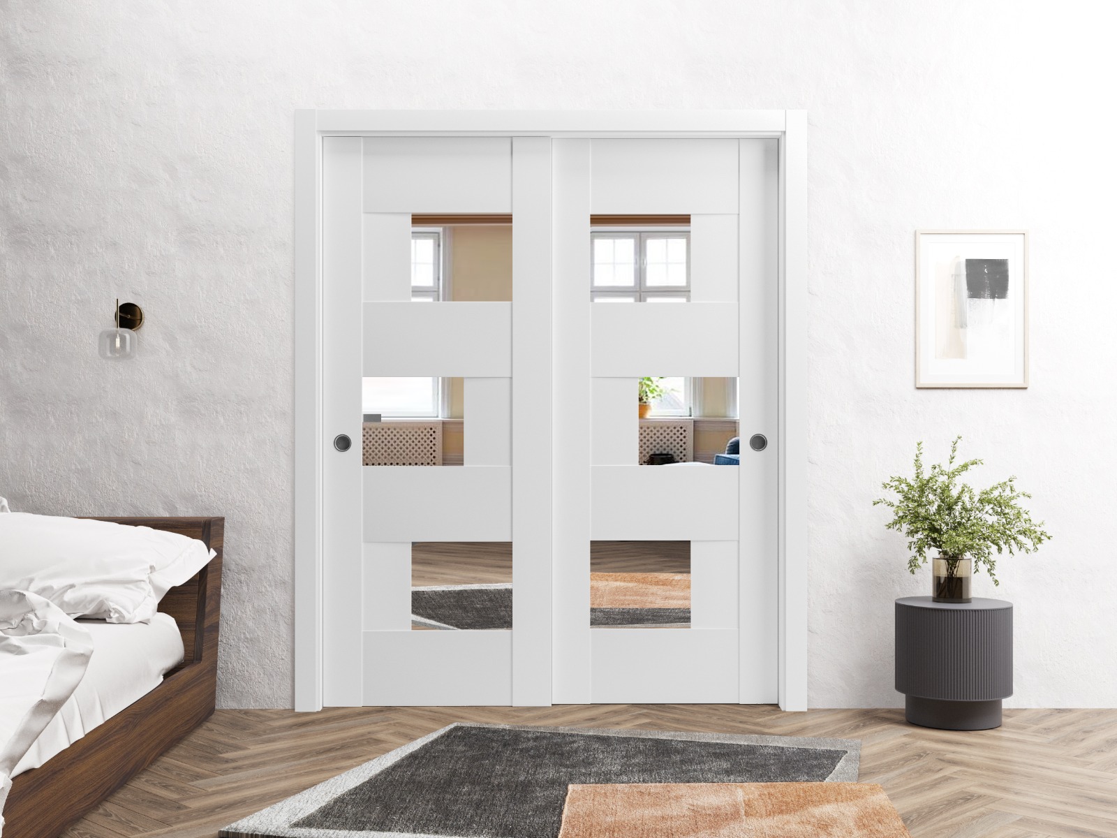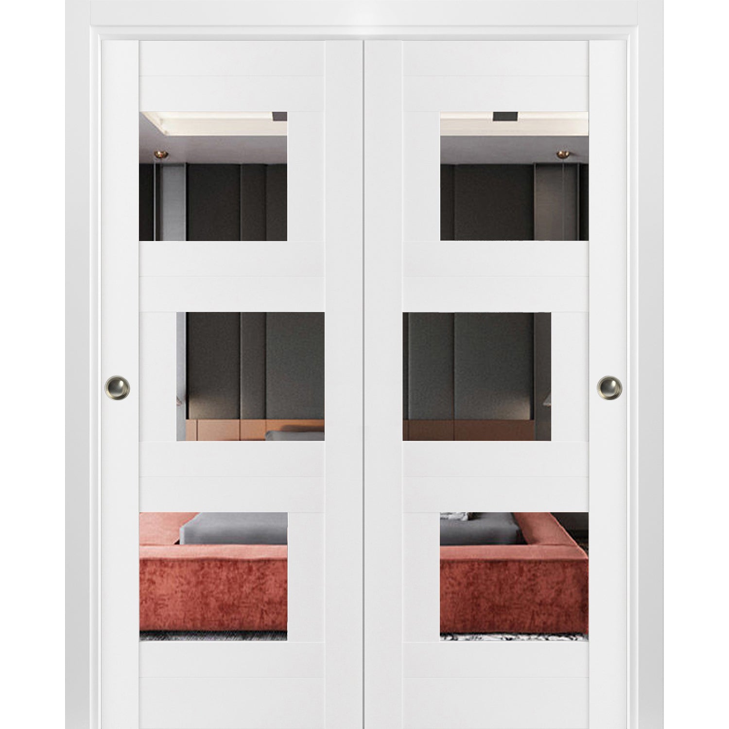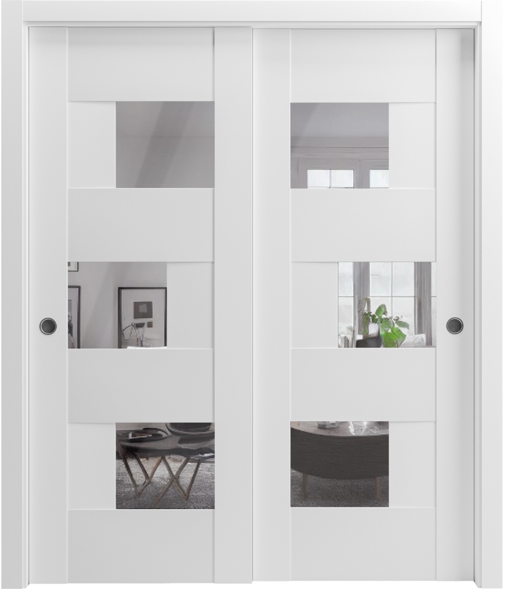 Sliding Closet Opaque Glass Bypass Doors / Sete 6999 White Silk with Mirror / Rails Hardware Set / Wood Solid Bedroom Wardrobe Doors
