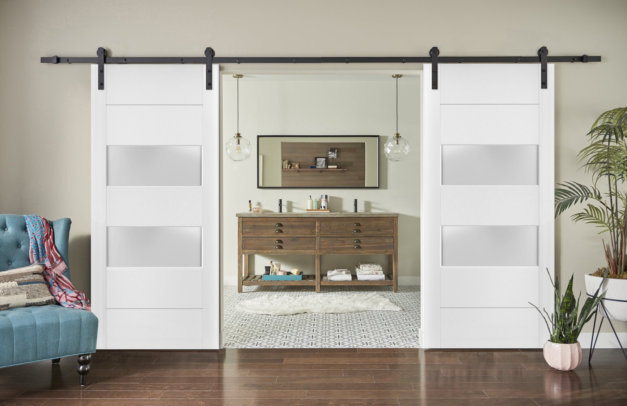 Nestled into the composition of the double barn doors is frosted glass, an ingredient that considerably enhances the allure of this stylish ensemble. The subtle, satiny texture of this glass allows soft light to admire your room’s interior while also maintaining your privacy.