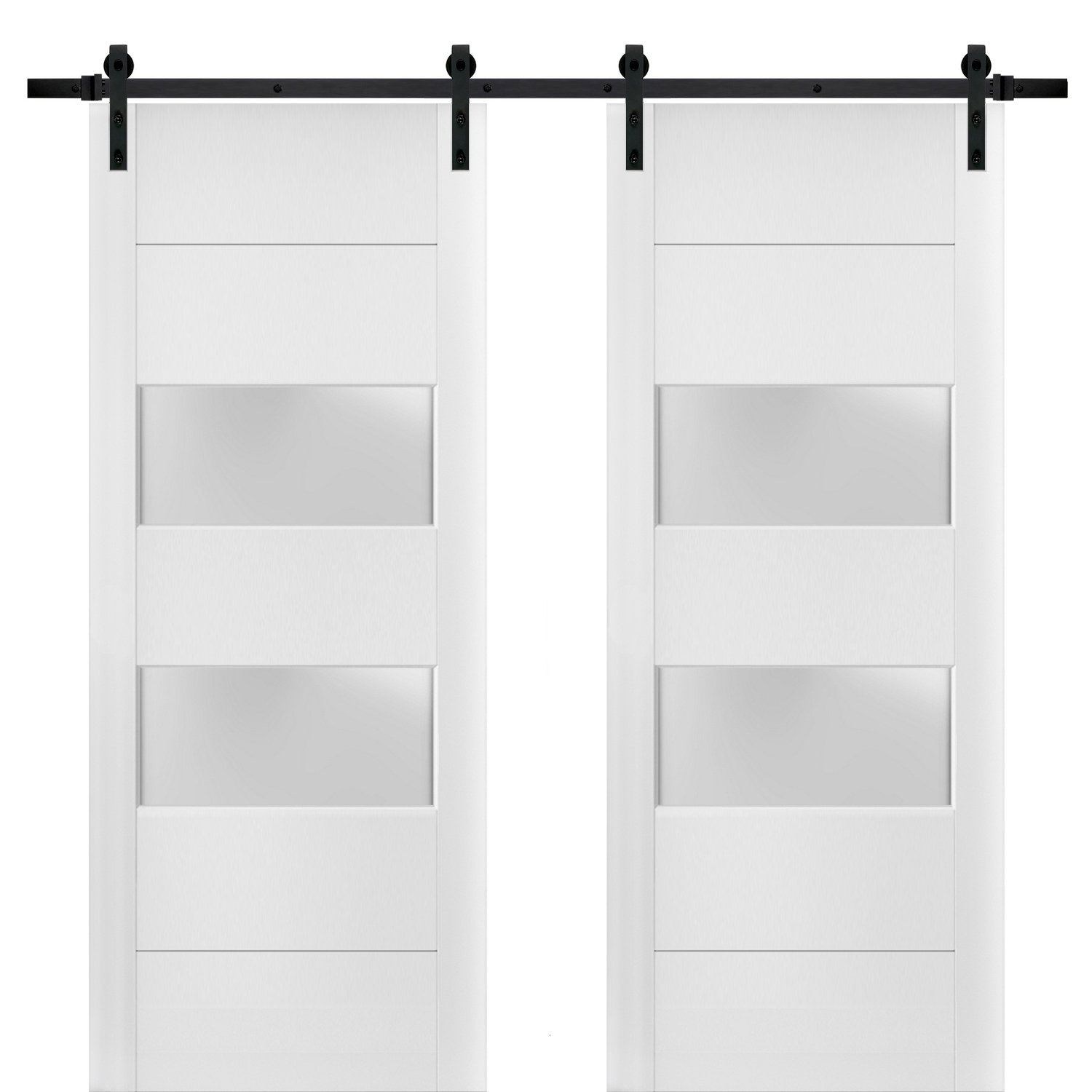 Sturdy Double Barn Door with 2 lites | Lucia 4010 White Silk with Frosted Glass | 13FT Rail Hangers Heavy Set | Solid Panel Interior Doors