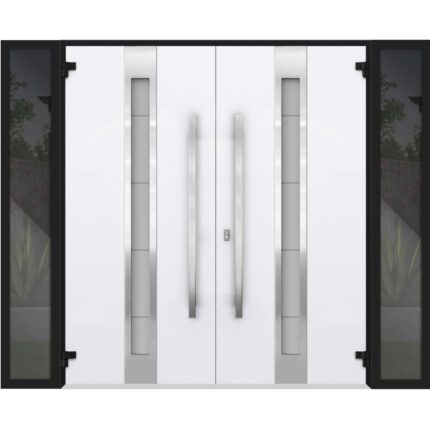 Front Exterior Prehung Steel Double Doors / Deux 1713 White Enamel / 2 Sidelight Exterior Black Windows / Stainless Inserts Single Modern Painted