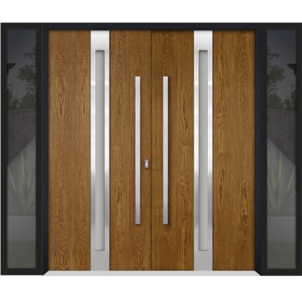 Front Exterior Prehung Steel Double Doors / Deux 1713 Natural Oak / 2 Black Sidelight Exterior Windows / Stainless Inserts Single Modern Painted