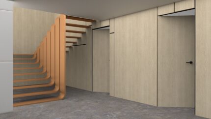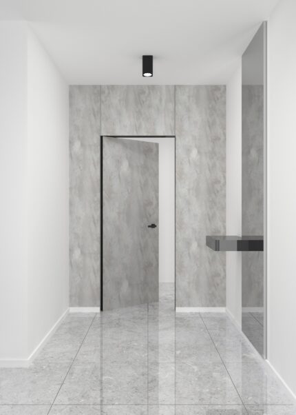 Invisible Solid Hidden Door with Handle | Planum 0010 Pietra with Black Hidden Frame Left-hand Inswing Black Frame | Concealed Hinges Lock Handle | Modern Frameless Doors